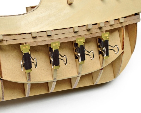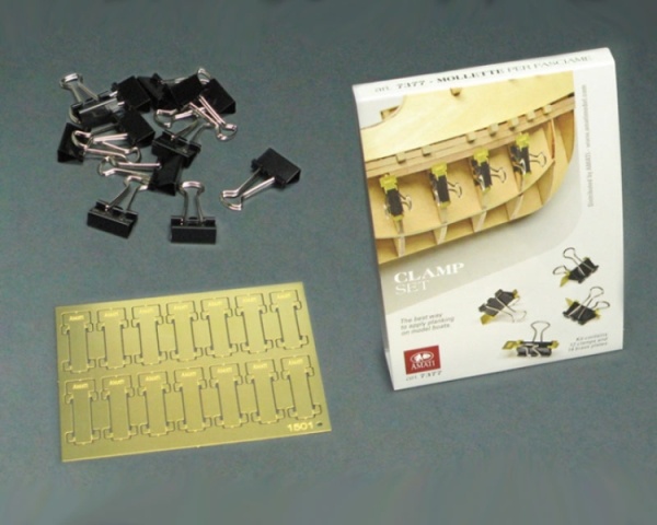 Spezialklemmen für Beplankungsleisten (12 Stück) Diese praktischen Spezialklemmen aus Metall können mit ihrer starken Klammer an de Spanten festgeklemmt werden und drücken mit ihrer Messingplatte die Beplankungsleisten gegen die Spanten. Sie können dabei auch eine gewisse Spannung aushalten, bis der Kleber getrocknet ist. Die Messingplatten können auch der jeweiligen Konturform angepasst (gebogen) werden. Eine praktische Hilfe, die die Leisten ohen Nadeln oder Nägel in Position hält. Diese praktische Klemmen vereinfachen die Holzbeplankung von Schiffsmodellrümpfen. Mit den Klemmen kann die anzuklebende Leiste an jedem Spant sicher fixiert werden.