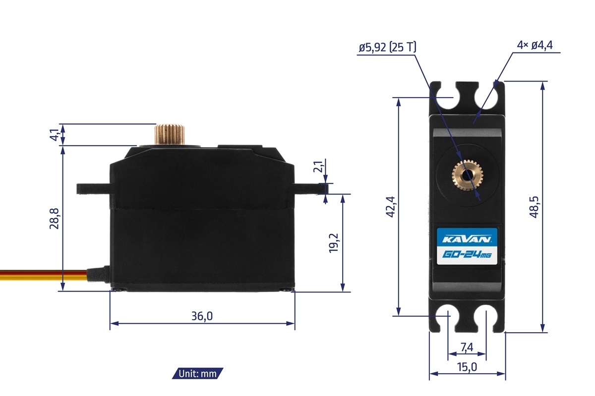 Superschnelles Digital Miniservo 25 g mit Metall-Getriebe und Spektrum der Versorgungsspannung 4,8-6,0 V, 2xBB, ideal für Flugzeug- und Hubschraubermodelle, kleine RC-Autos, RC-Schiffe u.ä. Stellkraft 4,0 kg.cm, Geschwindigkeit 0,08 s/60° bei 4,8 V, Stellkraft 4,5 kg.cm, Geschwindigkeit 0,07 s/60° bei 6,0 V. Abmessungen 36x15,2x28,8 mm, Gewicht 25 g.