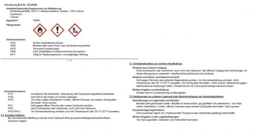 P101 Ist ärztlicher Rat erforderlich, Verpackung oder Kennzeichnungsetikett bereithalten. P102 Darf nicht in die Hände von Kindern gelangen. P210 Von Hitze, heißen Oberflächen, Funken, offenen Flammen und anderen Zündquellen fernhalten. Nicht rauchen. P211 Nicht gegen offene Flamme oder andere Zündquelle sprühen. P251 Nicht durchstechen oder verbrennen, auch nicht nach Gebrauch. P410+P412 Vor Sonnenbestrahlung schützen und nicht Temperaturen über 50 °C/122 °F aussetzen.